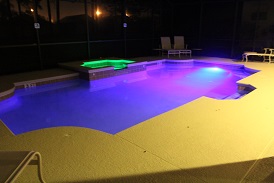 The large covered lanai overlooks a private sparkling 28ft pool with fan sprays & streamers to add to the fun. There is also a large jacuzzi /spa with waterfall, underwater mood lighting, & has a fitted child safety fence.