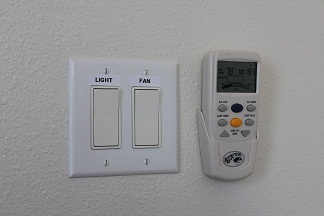 There is a large 72 inch 6 speed remote controlled near silent DC ceiling fan with light to compliment the air-conditioning & table lamp lighting