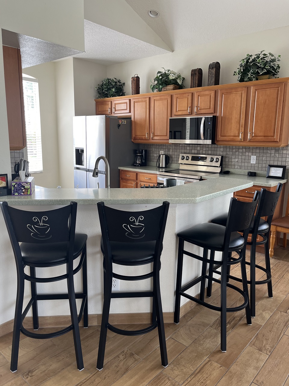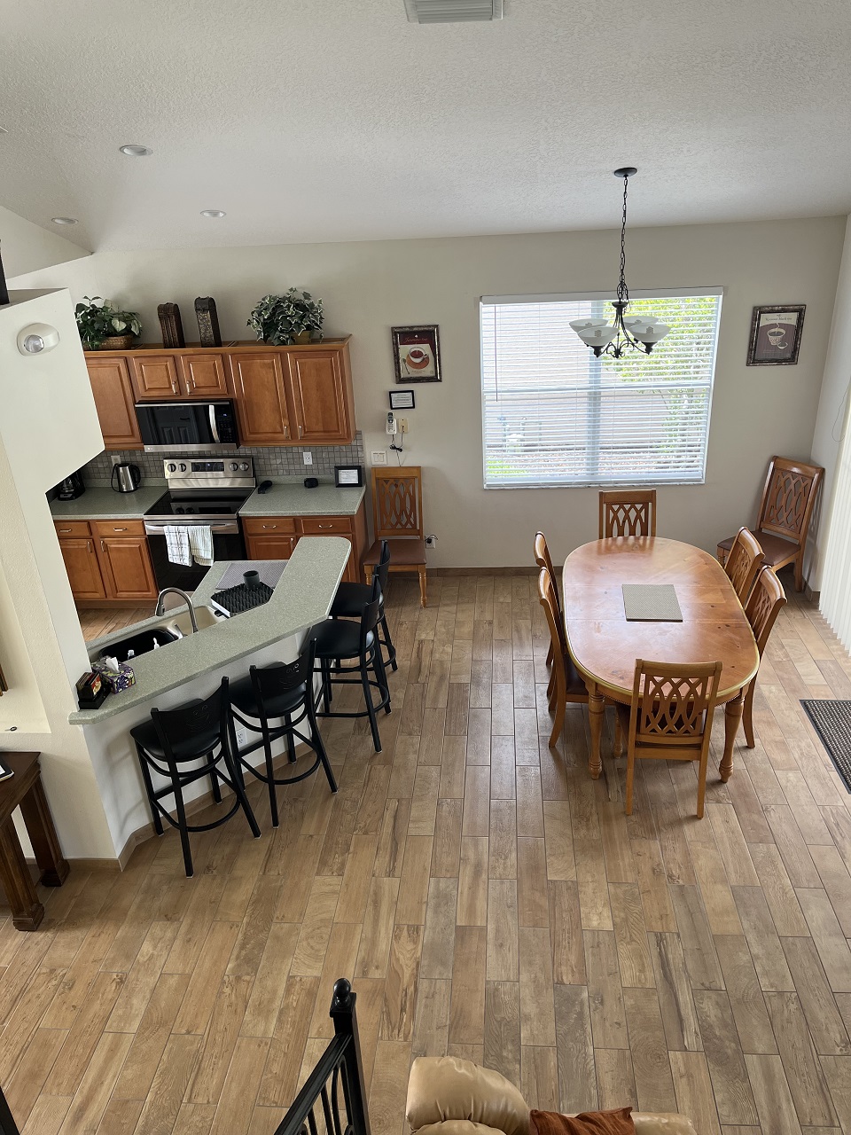 with its cathedral ceiling is light and airy with practical porcelain wood tile floor