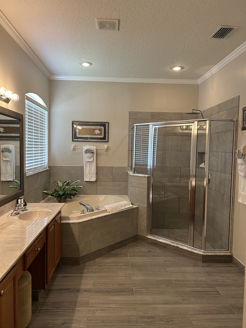 with luxury PVT wood effect laminate flooring, fresh paint and crown molding. 65" SMART LED TV,